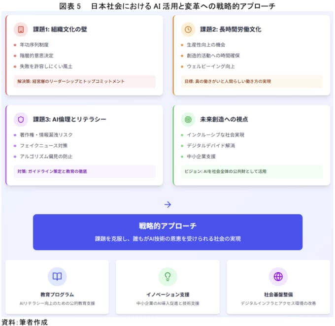 そのためには、公的機関によるAIリテラシー向上のための教育プログラムの提供、中小企業へのAI導入支援、デジタルデバイド解消への取り組みなどが求められる。