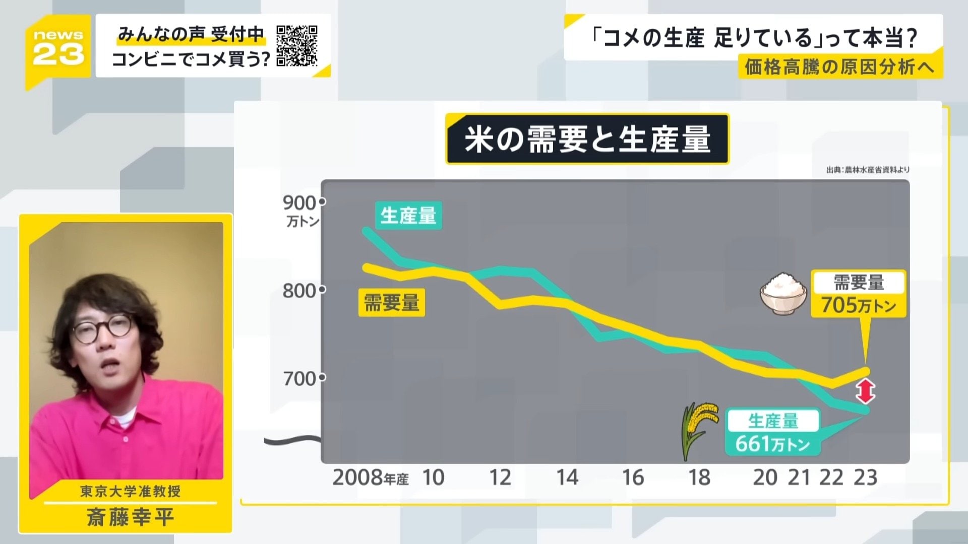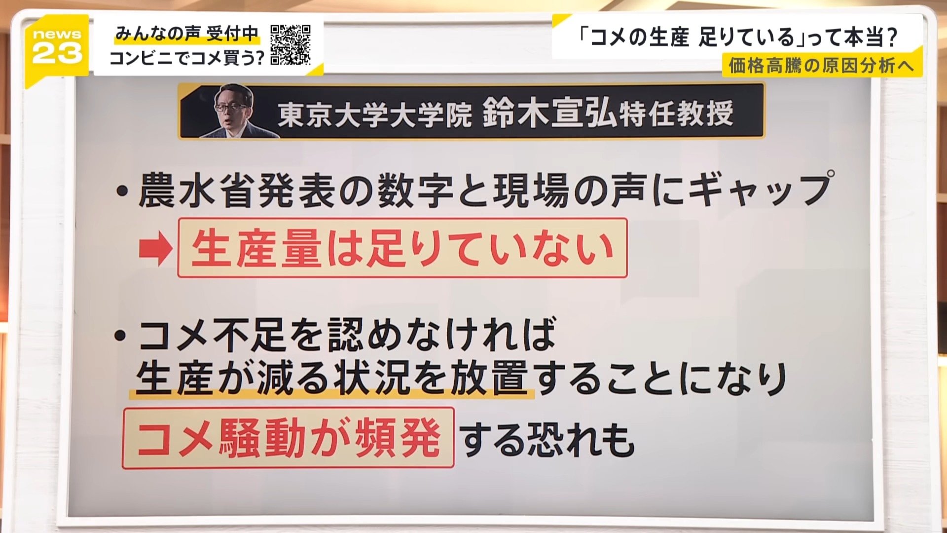 ただ、東京大学大学院の鈴木特任教授は、農水省が発表する数字と現場の声にギャップがあり、生産量は足りていないという見方をしています。このコメ不足を認めないと、生産量が減る今の状況を放置することになるから、今後、米騒動が頻発する恐れもあるともおっしゃっています。
