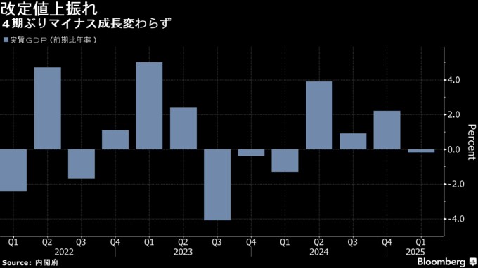 (ブルームバーグ):日本の1-3月期の実質国内総生産(GDP)改定値は、速報値から上方修正された。個人消費が上振れたほか、民間在庫の増加が押し上げに寄与した。ただ、修正後も4四半期ぶりのマイナス成長は変わらず、力強さに欠ける日本経済の姿を表している。