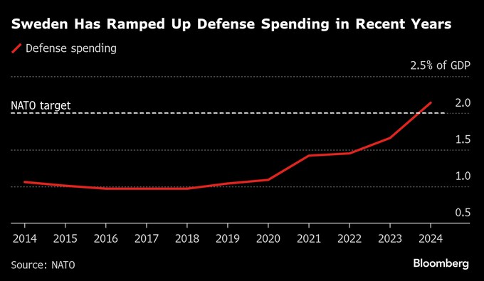 スウェーデンは2030年までに軍事費をGDP比3.5%とすることを目標に掲げている。これはハーグで合意が見込まれるNATOの新たな目標に沿うもので、さらに関連支出として1.5%の追加支出も求められる見通し。