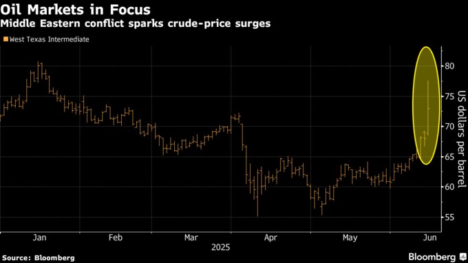 これまでのところ、最も大きく反応したのは原油相場。世界の原油生産の3分の1を担う中東地域で戦争が拡大するとの懸念から、ウエスト・テキサス・インターミディエート(WTI)先物は13日に7%余り値上がりし、2022年3月以来最大の上げを記録した。伝統的な安全資産である金やドルも上昇した。