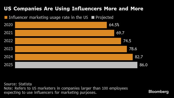 Statistaのデータでは、インフルエンサーをマーケティングで活用する米国企業は25年には86%まで増加すると予想されている。