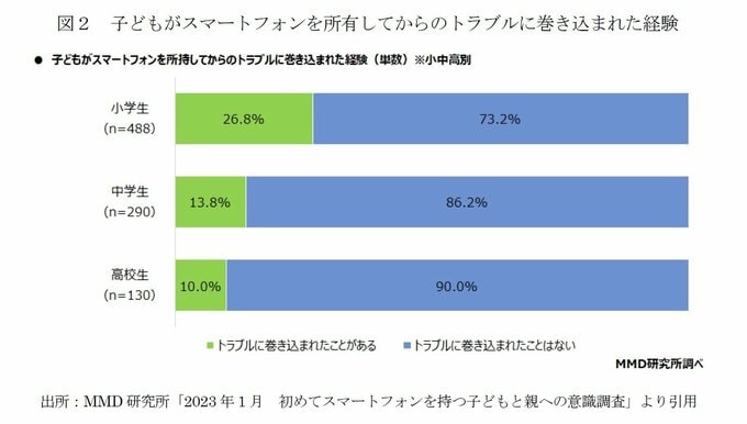 MMD研究所が、2022年以降に初めてスマートフォンを持った子どもがいる親1,000人を対象に実施した「2023年1月 初めてスマートフォンを持つ子どもと親への意識調査」によると、小学生の26.8%が「トラブルに巻き込まれた経験がある」と回答している。