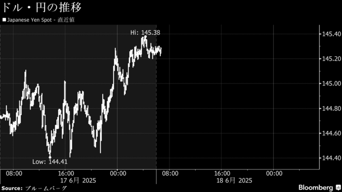 (ブルームバーグ):18日朝の東京外国為替市場の円相場は前日夕から下落し、1週間ぶりの1ドル=145円台で推移。中東情勢の緊迫化を受けてリスク回避の動きが強まっている。米国がより直接的に関与するとの観測が浮上しており、トランプ米大統領の発言に過敏に反応するドル主導の相場が続きそうだ。
