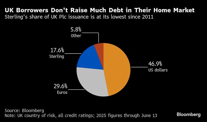 英企業の財務担当者は、行動で意思を示している。ブルームバーグがまとめたデータによれば、英国を拠点とする企業が今年これまでに発行した社債のうちポンド建ては2割未満で、2011年以来の低水準だった。ドル建てとユーロ建ての社債発行は、合わせて77%に上った。