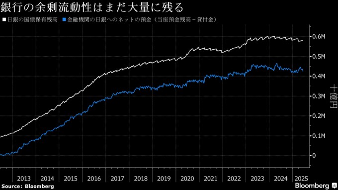 日銀がQTを開始した2024年8月(決定は7月31日)、日本株は歴史的な急落を記録したもののすぐに回復。日経平均株価は今週4カ月ぶりの高値を付け、比較的底堅く推移する。これまでのところQTの影響が限定されているのは、銀行セクターに潤沢な資金が残っているためだと、SMBC日興証券の村木正雄シニアアナリストはと説明する。