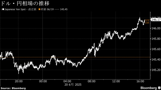 円は対ドルで下落し、一時0.5%安の1ドル=146円22銭を付けた。ニューヨーク時間の朝方に下げに転じ、その後は軟調な展開が続いた。