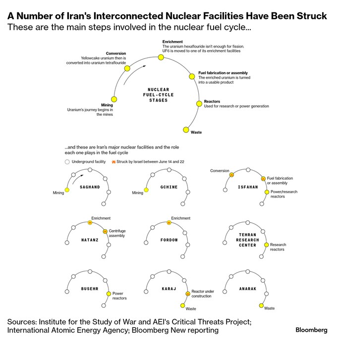 濃縮ウランが保管されているとされるイラン中部イスファハンの施設は、集積した工業用建造物を含め新たに大規模な被害を受けた様子が衛星画像で示された。破壊された施設内で「放射性物質と化学物質による汚染」が発生する恐れがあるとIAEAは先に警告していた。