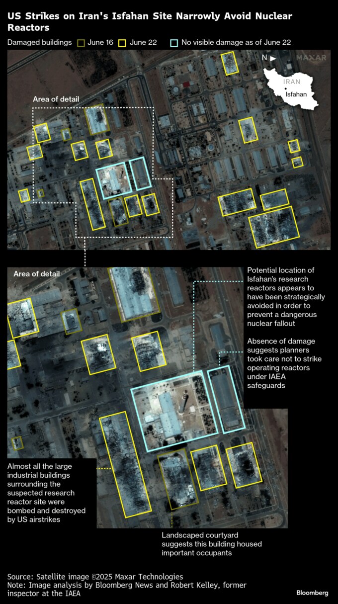 (ブルームバーグ):米空軍がイランの核開発計画に破壊的な攻撃を加えたにもかかわらず、重要な研究施設の原子炉を攻撃しないよう注意を払っていたことが衛星画像で示唆された。