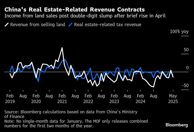 政府の歳入全体も減少。1-5月の累計で11兆2000億元にとどまっており、不動産市場の縮小が影響している。