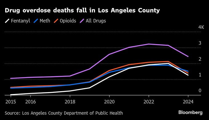 (ブルームバーグ):米カリフォルニア州ロサンゼルス郡では昨年、薬物過剰摂取・中毒に関連した死亡件数が前年比22%減少し、過去最大の改善幅を記録した。合成麻薬フェンタニルに関連する死亡件数の大幅な減少が寄与した。