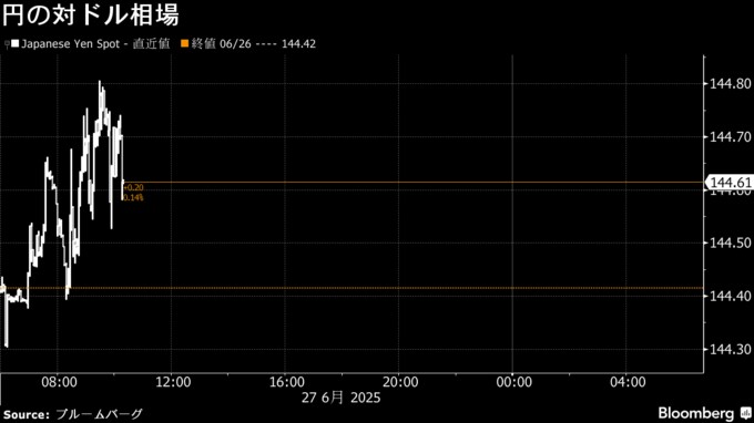 (ブルームバーグ):27日の東京外国為替市場で円相場は1ドル=144円台半ばで推移。米中が関税休戦に署名したことや、「報復税」と呼ばれる899条項の提案がトランプ米大統領の推進する大型税制法案から削除されることを受け、リスク志向のドル買い・円売りが優勢だ。