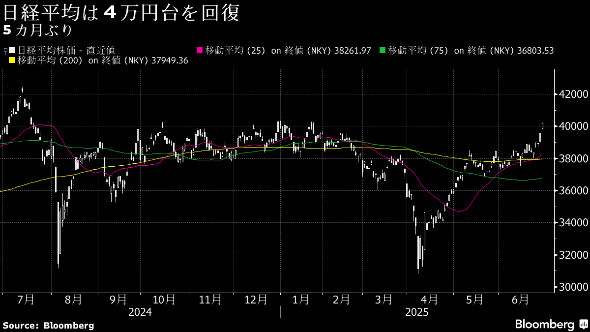 (ブルームバーグ):27日の東京株式相場は4日続伸。東証株価指数(TOPIX)は取引時間中の年初来高値を更新し、日経平均株価は5カ月ぶりに4万円台を回復した。米中が貿易合意に署名し、米ホワイトハウス報道官が上乗せ関税の期限延長に含みを持たせたことで投資家心理が上向いている。