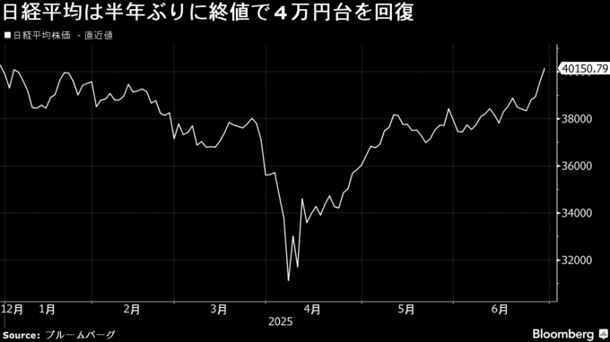 (ブルームバーグ):27日の東京株式市場で日経平均株価が大幅に続伸し、前日比1.4%高の4万150円79銭で取引を終えた。年初来高値を更新して1月7日以来、約半年ぶりに終値で4万円台を回復した。