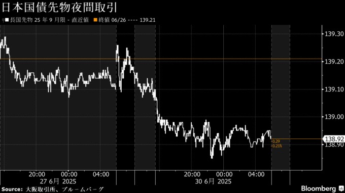 先物夜間取引で9月物は27日の日中取引終値比15銭安の138円92銭で終えた。27日の米10年国債利回りは前日比4ベーシスポイント(bp)高い4.28%程度で引けた。