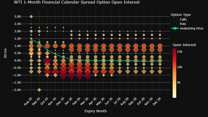 オプションの建玉が膨らむ中、投資家の関心が異例の高まりを見せたのが原油のカレンダースプレッド取引だ。