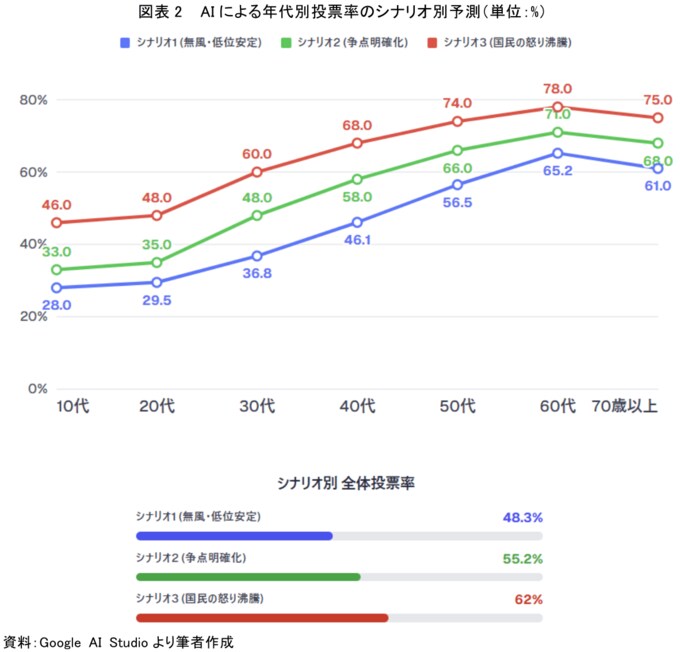 AIによる年代別の投票率予測は、各シナリオの性格をより鮮明に描き出す。