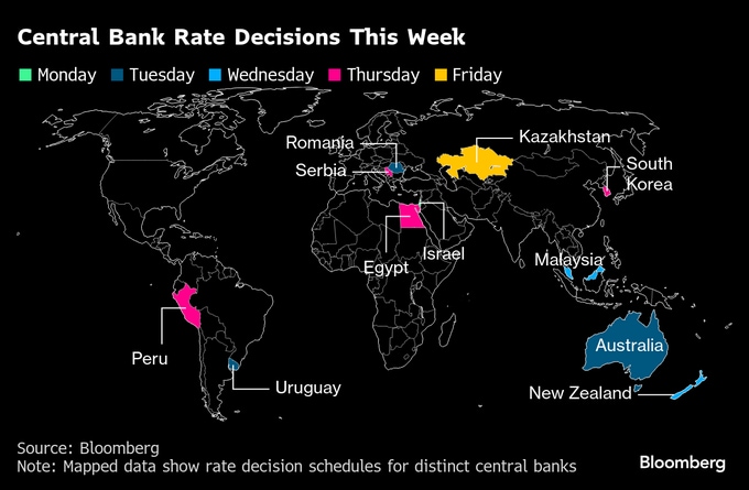 来週はこのほか、米連邦公開市場委員会(FOMC)の最新議事要旨が発表されるほか、オーストラリアで利下げの可能性がある。主要新興国グループ「BRICS」の首脳会議も6日からブラジルで開催される。