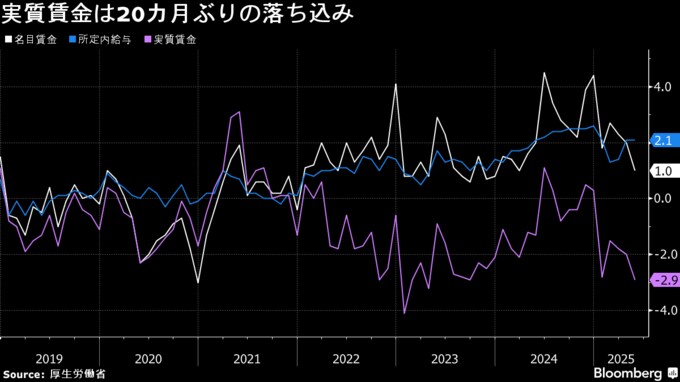 厚生労働省が7日発表した毎月勤労統計調査(速報)によると、「持ち家の帰属家賃を除く」消費者物価指数で算出した実質賃金は前年同月比2.9%減と、2023年9月以来の低水準となった。市場予想は1.7%減だった。名目賃金に相当する1人当たりの現金給与総額は1.0%増と、市場予想(2.4%増)を大きく下回った。賞与など特別に支払われた給与が18.7%減少したことが影響した。