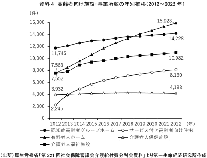 初めに、死亡場所の構成比において施設死割合が上昇する理由を社会環境変化の観点から考える。まず、2000年に創設された介護保険制度の定着などに伴う高齢者向け施設数の増加が挙げられるだろう。以下のグラフは2012年から2022年までの高齢者向け施設・事業所数の推移を年別で示したものだが、その数は増加傾向にあることが分かる。