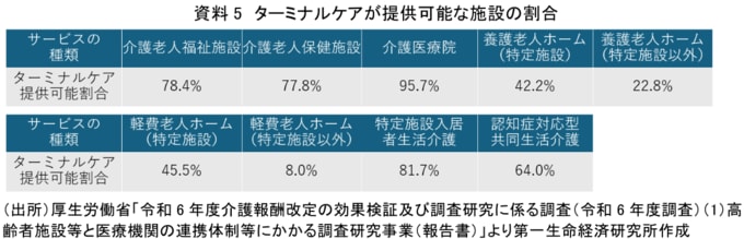 高齢者向け施設数が増え、利用者数が増加する中で、施設での看取り体制が整備されてきたことも割合上昇理由の1つと考えられるだろう。厚生労働省は2024年、高齢者向け施設が提供可能な医療処置について施設種類ごとの割合を調査した。外部医療機関の支援などを受けながらターミナルケアの提供が可能な施設の割合は、介護老人福祉施設で78.4%、介護老人保健施設で77.8%、介護医療院で95.7%などとなっている。