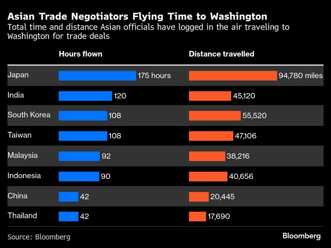 まだ米国との通商合意に至っていないアジア各国の交渉団が、ワシントンまでの往復で積み重ねた飛行時間と移動距離は以下の通り。