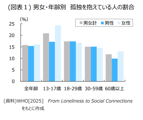 報告書によると、世界全体で人口の15.8%が孤独を抱えており、若年層ほど高い割合となっている。
