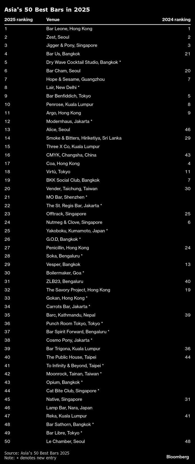 (ブルームバーグ):今年の「アジアのベストバー50」番付で香港の「Bar Leone(バー・レオーネ)」が再び首位となった。トップ3の順位は変わらず、ソウルの「Zest」が2位、シンガポールの「Jigger & Pony」が3位に入った。