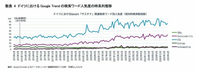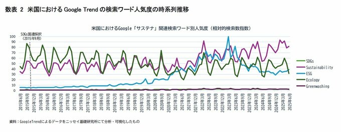 たとえば、米国では「Sustainability」や「ESG」が長期的に高い検索水準を維持しており、特にESGは2023年に人気度が上限の100を記録している。