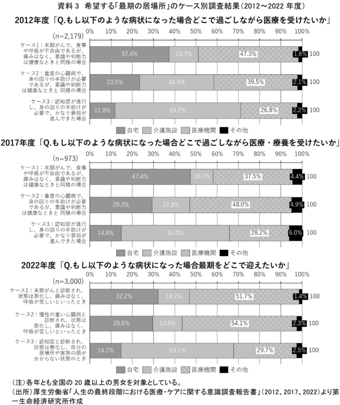 2012年度・2017年度・2022年度の厚生労働省「人生の最終段階における医療・ケアに関する意識調査」(以下、厚労省調査と呼ぶ)では「人生の最終段階において最期を迎えたい場所」などについてケースごとの調査が実施されている。