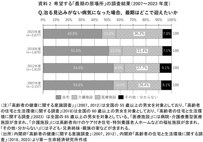 2007年度・2012年度の内閣府「高齢者の健康に関する意識調査」、2018年度・2023年度の内閣府「高齢者の住宅と生活環境に関する調査」(以下、内閣府調査と呼ぶ)では、希望する「最期の居場所」について調査している。