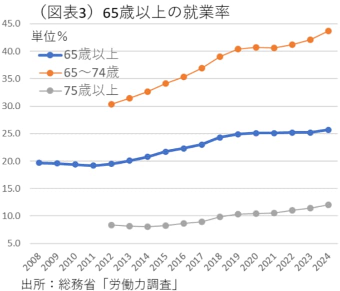 就業に関する厳密なデータとして、総務省「労働力調査」の個人別の就業率の推移をみると、65歳以上の人口では就業率が2019〜2024年にかけて頭打ちになっている。