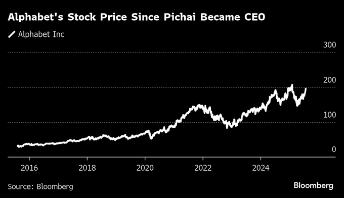 ピチャイ氏は、1998年のグーグル創業時のメンバーではなかったが、同社CEOとしての在任期間は歴代で最も長くなった。8月には在任10年となる。