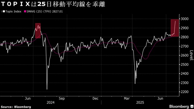 TOPIXは25日移動平均線を5%以上上回った。一般的に同線からの乖離(かいり)率が5%を超えると、相場が目先調整局面を迎えるサインとされる。