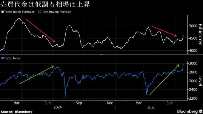 TOPIXの上昇は昨年7月と同様に売買代金の増加を伴っておらず、株高への確信が投資家の間で広がっていない可能性を示唆する。