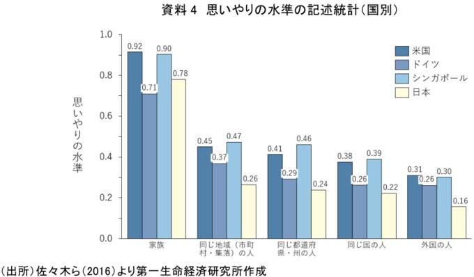このプロセスを元に、寄付が進まない理由、推し活消費が増えている理由を考えてみる。一つは、そもそも日本人は疎遠な対象には利他的ではないということだ。こういった利他性を国際比較したデータを紹介する。資料4は、米国、ドイツ、シンガポール、日本の思いやりの水準(他者のためなら、自分の利益をどれだけ犠牲にできるかを数値化したもの)を比較したグラフである。日本人が見知らぬ外国人に対して抱く思いやりの水準は0.16と、家族に対するものが0.72に対して約5分の1であり、アメリカ等の諸外国と比較しても低い水準であることがわかる。