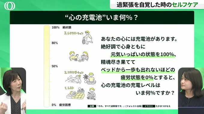 自分の心を充電池に例え、その残量をもとに過緊張への対処を行うことが重要だとしています。