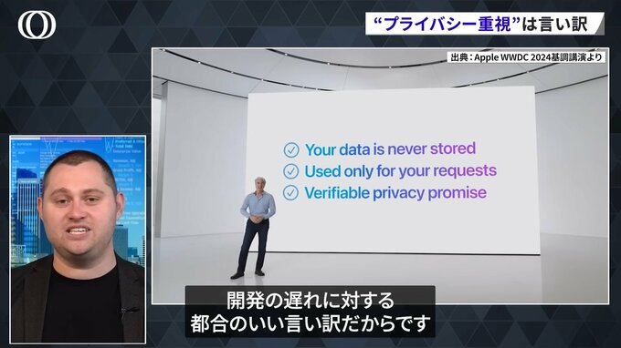 「『性能は劣るかもしれませんが、プライバシーは万全です』という理屈は、もはや消費者には響きません。人々は最高のAI機能を求めており、プライバシーを開発遅れの言い訳にはできません」