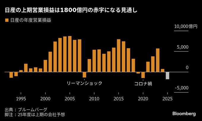 (ブルームバーグ):経営の立て直しを進める日産自動車は30日、上期(4-9月)の営業損益が1800億円の赤字になる見通しだと発表した。米国関税の影響は当初想定よりも緩和される見通しだが第2四半期にかけて損失が膨らみ、下期は見通しも立っていない状況で再建への道は険しいとの見方が出ている。