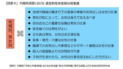調査では、9つの「固定的性別役割分担意識」が、出身地にあったか、あるいは現住地にあるかどうかを回答してもらい、性別、地域別で取りまとめられている。
