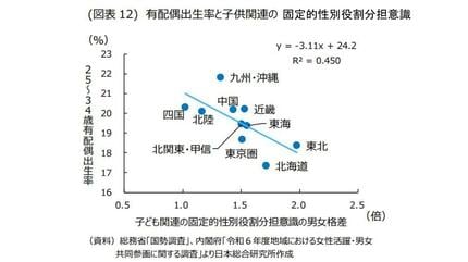 固定的性別役割分担意識については、「固定的性別役割分担意識」そのものというよりも、その存在に気付かない男性が多く、男女格差が大きい地域ほど、子どもを持つことやもう 1 人産むことに対する夫婦間の合意が得られにくくなり、有配偶出生率が低くなる可能性が指摘できる。