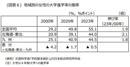 2000 年には、九州に比べて低かった北海道・東北の女性の大学進学率が、2020年にはほぼ同一の水準まで高まり、その分晩婚化が進んだのである。