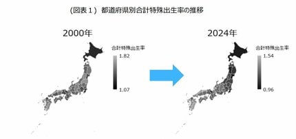 都道府県別の合計特殊出生率をみると、西日本で高く、東日本が低い西高東低の傾向が顕著である。こうした傾向は 2024年に限ったことではなく、近年、合計特殊出生率が発表されるたびに話題となっている。