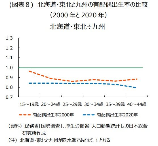 有配偶出生率が、長期にわたり九州の8割強という状況に大きな変化がみられないことからみて、北海道・東北の有配偶出生率の低さは、「地域特性」という一言で片づけられがちであるが、ここではもう少し踏み込んで考えてみたい。