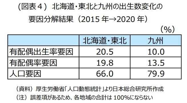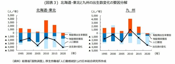 ただし、2020 年のデータを子細に見ると、北海道・東北と九州の有配偶率要因と有配偶出生率要因の出生数下押し効果に、明確な相違がみられた。