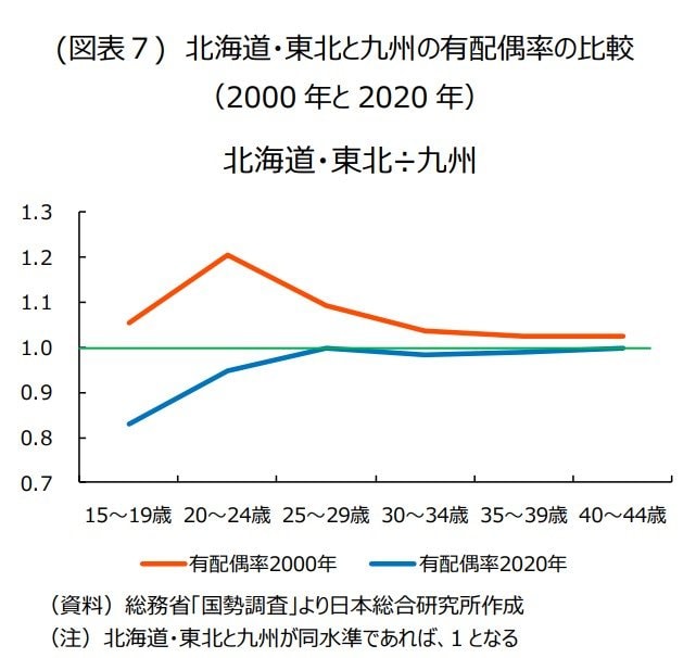 すなわち、北海道・東北では、九州に比べて顕著であった大学進学率の上昇によって25歳までの有配偶率が大きく低下したことが、有配偶率の視点で見た北海道・東北の出生率低下の一因である。