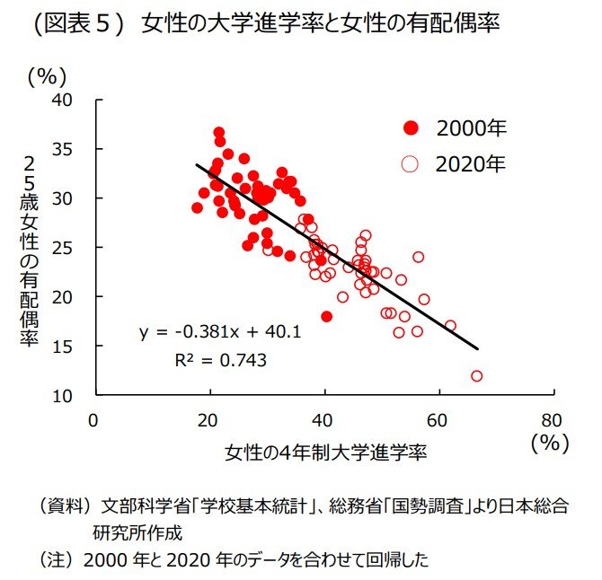 女性が若いうちに結婚するかどうかは、大学進学率でほとんど説明可能であることが分かる。