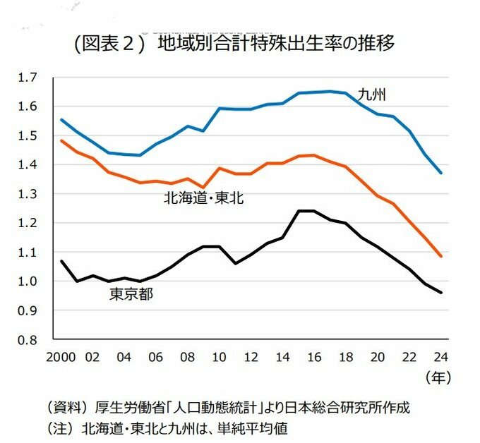 東京都を除外しても、なお西高東低の印象をぬぐえないのは、北海道・東北と九州の間に、大きな差異が生じているためである。両地域における 2024年の合計特殊出生率(単純平均)は、北海道・東北が1.09、九州が1.37であった。