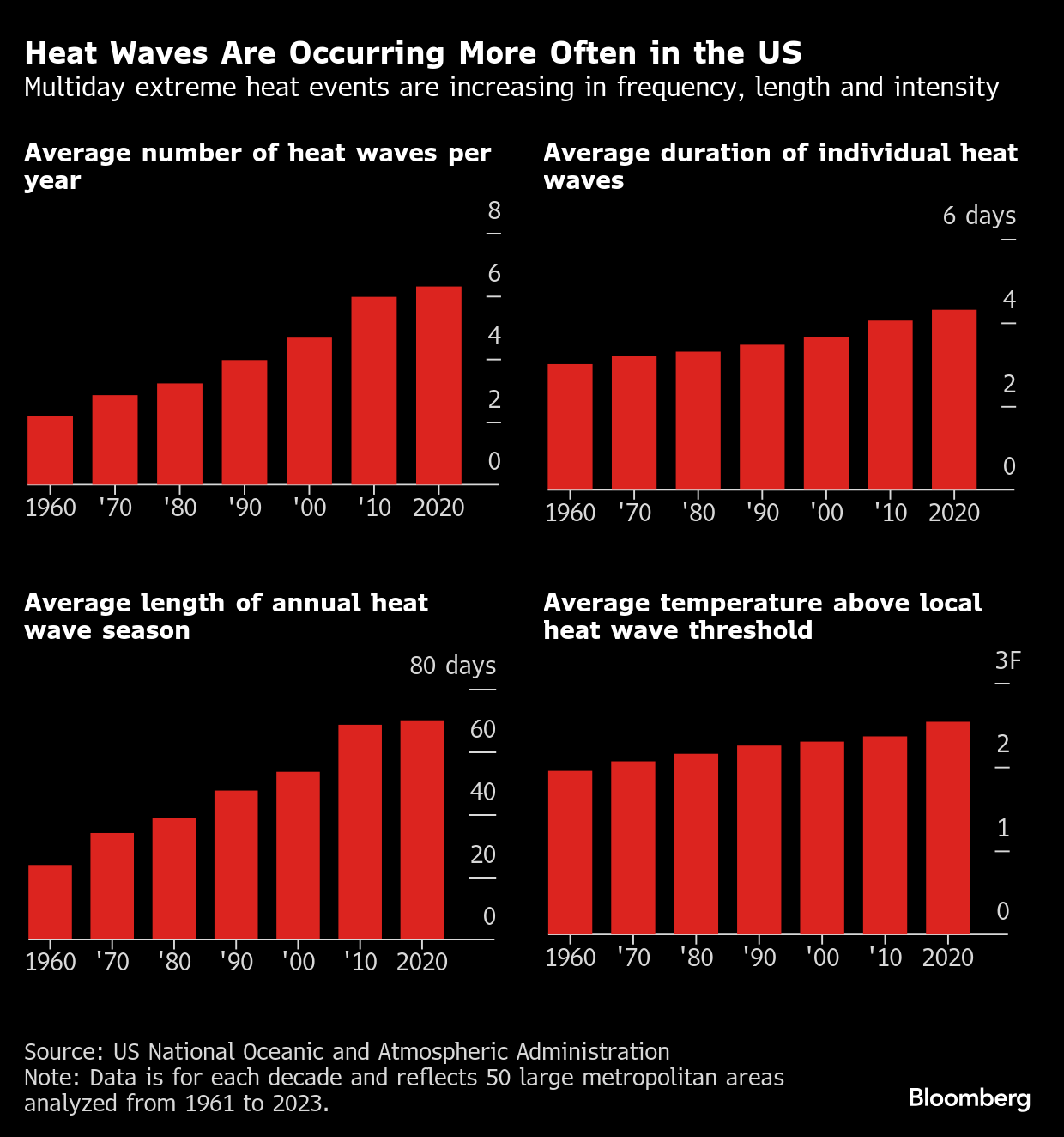 米国では熱波の発生が一般的になりつつあり、1960年代は主要都市で年平均2回だった頻度が、2020年代になると同6回にまで増加。熱波による死者は、洪水やハリケーンを含む他のどの気象現象よりも多く、米国内で最も致命的な天候要因となっている。