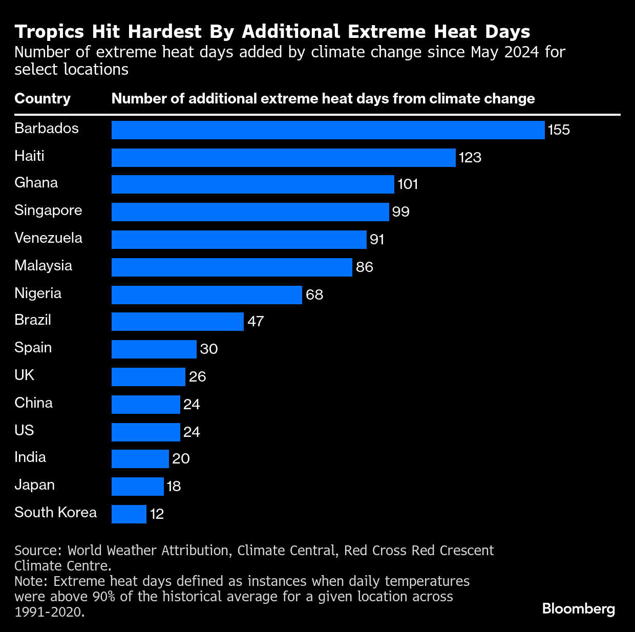 ロンドンに本拠を置くワールド・ウェザー・アトリビューション(WWA)と米非営利団体クライメート・セントラル、赤十字気候センターによる調査によれば、世界人口の半分近くが気候変動の影響で猛暑日が少なくとも30日増えた状況に見舞われている。バルバドスやハイチをはじめとするカリブ海や太平洋の島国では100日以上増えたという。